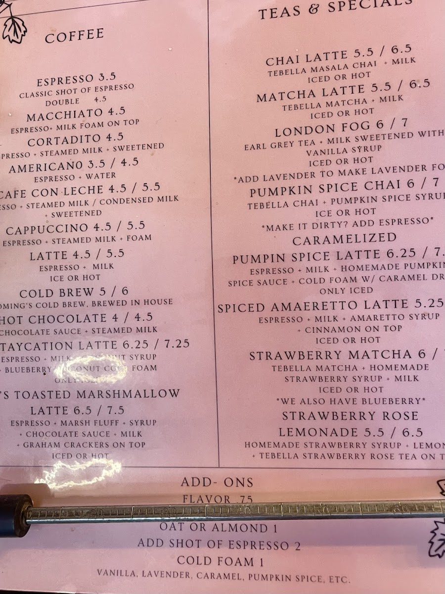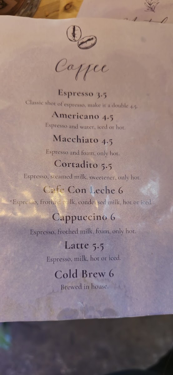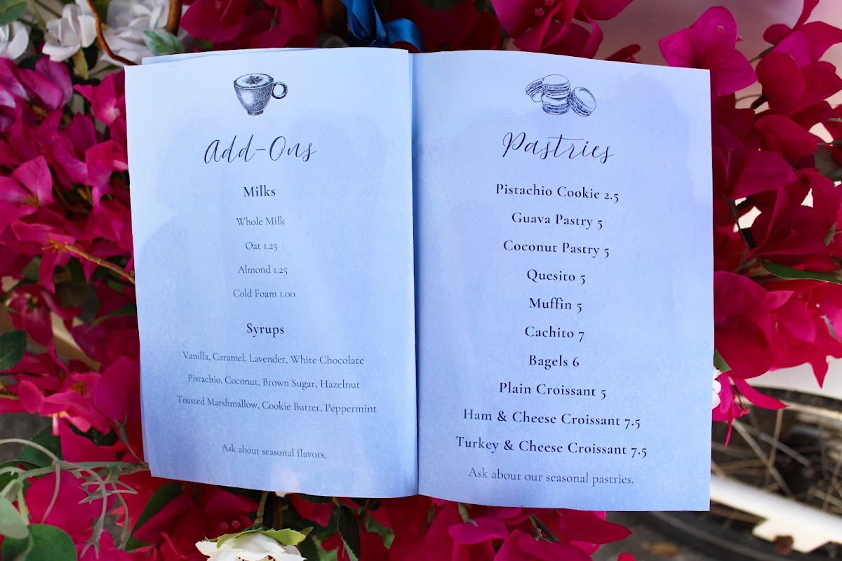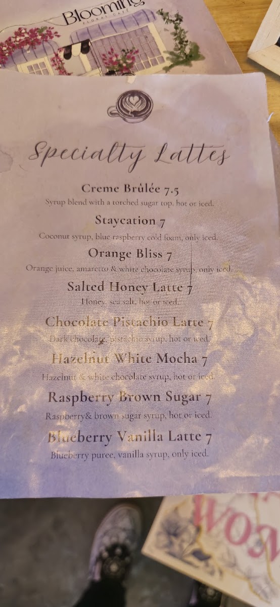 Reflecting on the offerings at Blooming Floral Cafe, the menu stands out for its thoughtful mix of classics and inventive signatures, giving guests plenty to explore while still feeling approachable. Coffee lovers can rely on familiar staples like Espresso, Americano, Macchiato, and Cortadito, while the Cafe Con Leche adds a comforting, traditional touch. The Specialty Lattes category is where the café’s creativity really shines, featuring indulgent options such as Creme Brulee, Staycation, Cookie Butter, Salted Honey, and Chocolate Pistachio, each crafted to deliver a unique flavor experience. Matcha fans have an equally enticing selection, from the straightforward Matcha Latte to more playful choices like Strawberry Matcha Latte, Blueberry Matcha Latte, Lavender Matcha Latte, and the refreshing Matcha Lemonade. Tea drinkers aren’t overlooked either, with cozy favorites such as Chai Latte, London Fog, and Lavender Fog rounding out the warm beverage offerings. For those seeking something a bit more distinctive, the café’s additional creations-Berry Chantilly Matcha Latte, Strawberry Rose, Ginger Pear, Lavender Citrus Sage, and Pumpkin Spice Chai-offer aromatic, floral, and seasonal twists that contribute to the shop’s charming botanical theme. Overall, the menu feels both well-curated and delightfully adventurous, leaving a lasting impression of a café that values flavor, craftsmanship, and a touch of whimsy.